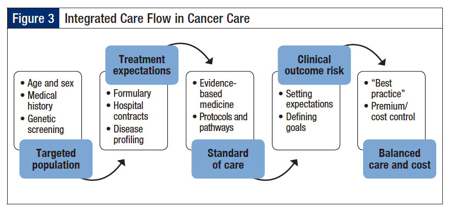One construct that seeks to define a process for value-driven care–the integrated care flow–was discussed by Dr Lawless (Figure 3). In this process, targeted evidence-based care is delivered via broadly accepted pathways or protocols to patient populations that are stratified according to their demographics, medical history, and genomic profile. By setting clear expectations and defining goals regarding cost to benefit of treatment, healthcare stakeholders can define and apply best practices in the context of value (rather than clinical benefit alone), thereby providing optimal care while reducing waste and containing cost.