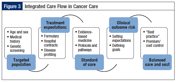 One construct that seeks to define a process for value-driven care—the integrated care flow—was discussed by Dr Lawless (Figure 3). In this process, targeted evidence-based care is delivered via broadly accepted pathways or protocols to patient populations that are stratified according to their demographics, medical history, and genomic profile. By setting clear expectations and defining goals regarding cost to benefit of treatment, healthcare stakeholders can define and apply best practices in the context of value (rather than clinical benefit alone), thereby providing optimal care while reducing waste and containing cost.