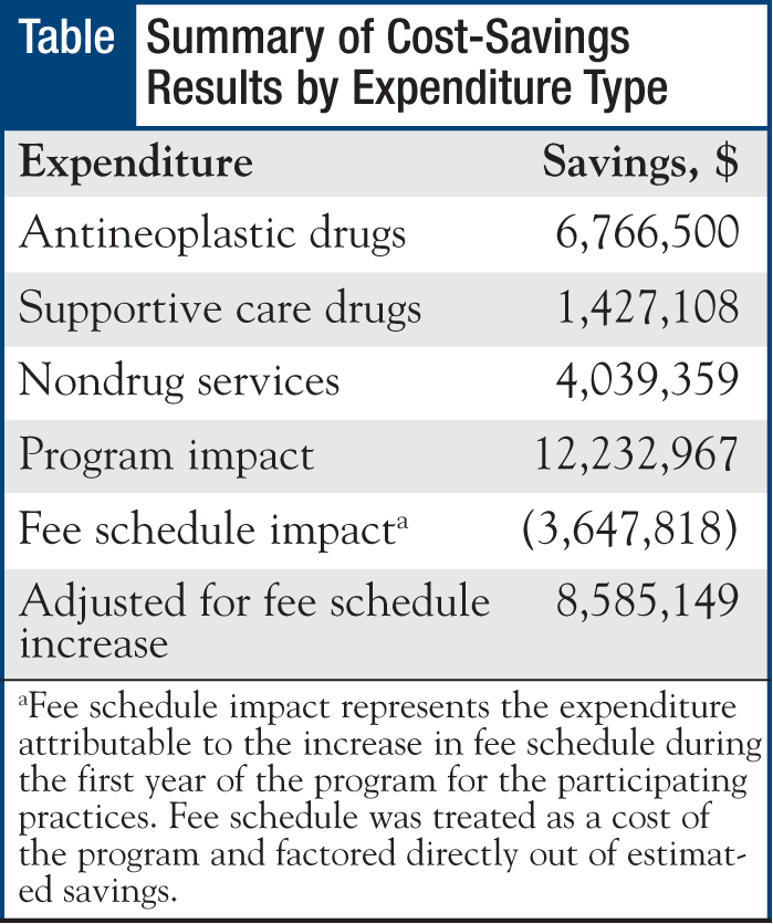 Estimated savings between Pathways participants and nonparticipatingcenters (Table) were calculatedfor antineoplastic drugs ($6,766,500),supportive care drugs ($1,427,108),nondrug services ($4,039,359), andtotal costs ($12,232,967). When thecosts of the year-1 fee scheduleincrease for participating practiceswere factored out, the total savingswere estimated at $8,585,149.