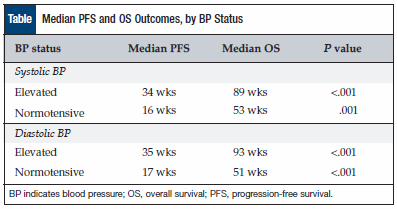 In the final multivariate analysis, investigators analyzed outcomes separately, according to maximum diastolic and systolic BP. Median progression free survival and median overall survival were significantly improved with elevated systolic or diastolic BP (Table).