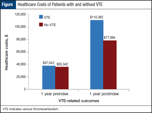 High Healthcare Costs Patients who developed VTE within 3.5 months postindex treatment had healthcare costs at baseline that were comparable with persons not developing VTE. During first-year postindex treatment, the costs for patients with VTE were significantly higher than those for patients without VTE; the increase was driven primarily by higher inpatient and outpatient costs (Figure). The overall healthcare costs 1 year before receiving chemotherapy were $37,542 for patients developing VTE and $35,342 for those without VTE. By 1-year postindex treatment, costs had risen to $110,362 and $77,984, respectively, Dr Lyman reported. Costs were higher for patients with VTE in each category of expenditure: inpatient, outpatient, emergency de - partment, and pharmacy. “Similar results were seen for patients who developed VTE within 12 months postindex,” he said. “The decision for the use of thromboprophylaxis in cancer patients undergoing chemotherapy should be based on the balance between the potential benefits and harms, including any bleeding risk associated with a therapy,” Dr Lyman pointed out, emphasizing the need to assess costeffectiveness and cost-utility of prevention in this setting.