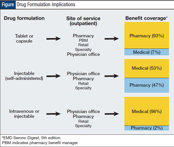 Management Challenges The oncology drug management challenges are directly related to health insurance or payer benefit design, according to Kirby J. Eng, RPh, Director, Medical Pharmacy Manage - ment, CVS Caremark. The clinical challenges include the site of service and coordination of care, therapy information, and adherence to therapy. The drug formulation has several implications to health plans (Figure). If a drug is a tablet or a capsule, the site of service typically would be a pharmacy channel. Benefit coverage, given the site of service and drug formulation, overwhelmingly, would fall under pharmacy benefit. For selfadministered injectable drugs, the site of service would be the physician’s office or, increasingly, the pharmacy— retail or specialty. Health plans were split on benefit coverage for selfadministered injectables; increasingly it is placed under the pharmacy rather than the medical benefit.