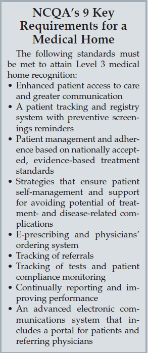 The NCQA is now trying to determine the recognition process for other subspecialty practices, possibly developing criteria for medical home neighbor recognition. They will likely open up that process to other practices within the next 18 to 24 months. For a practice to be recognized as a medical home, it must currently meet 13 essential NCQA standards of patient-centric care, which our practice has surpassed. When we applied there were only 9 criteria, and the additional 4 are extensions of some of those 9.