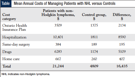 The mean cost difference between the NHL and the control groups represents the mean cost attributable to NHL diagnosis and treatment.