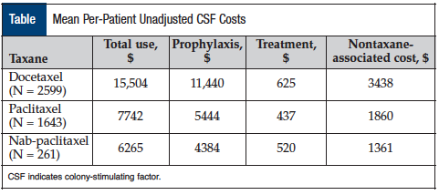 Investigators used actual paid medical claims from a national commercial payer (Ingenix Consulting). The data-set included more than 56 million procedure claims from more than 350,000 unique patients with cancer treated between 2006 and 2009. CSF use was defined as prophylactic (days 0-5 posttaxane administration), treatmentrelated (days 6-21 posttaxane administration), or nontaxane-associated (all other CSF administration). In calculating daily CSF costs, investigators controlled for age, comorbidity score, prior chemotherapy use, and concurrent chemotherapy use. The primary outputs of the analyses were CSF use and daily per-patient CSF costs adjusted for those variables. The study included 2599 patients receiving docetaxel, 1643 receiving paclitaxel, and 261 receiving nab-paclitaxel. The average number of days receiving a taxane were 91, 88, and 156, respectively. Dr Force suggested that patients may be receiving more nabpaclitaxel because of its better tolerability. "We have shown in previous studies that patients with nab-paclitaxel actually have less neutropenia, and neutropenia is one of the main reasons for discontinuing the taxanes," he pointed out.