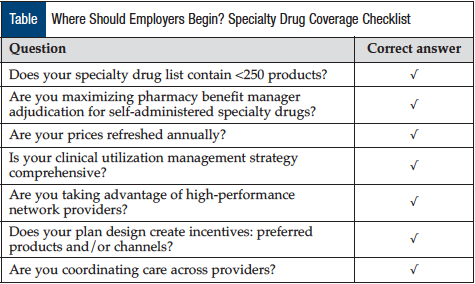 To ensure that employers are striking the right balance between advocating for their members and being fiscally responsible, she offers a checklist of issues for employers to consider before embarking on a specialty drug coverage program (Table). This list outlines the questions that are important to consider when looking for a benefit design for specialty drugs.