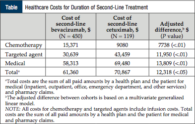 The backbone chemotherapy, however, was more expensive for the patients receiving bevacizumab: $15,371 versus $9080 for cetuximab, which was an adjusted difference of $7738.
