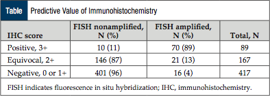 HER2 amplification was detected in 89% of IHC 3+ cases, 13% of IHC 2+ cases, and in 4% of IHC 0 to 1+ cases (Table). Accordingly, using FISH as the reference standard, the positive predictive value of a positive IHC test (3+) was 89%, and the negative predictive value of a negative test was 96%. Importantly, the positive predictive value of an equivocal IHC score (2+) for detecting HER2 amplification was 13%, he said.