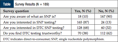 Ms Howe and colleagues studied patient interest in these kits, as well as their willingness to pay for SNP testing. The study included 189 women (mean age, 49 years) from the national Cancer Genetics Network.