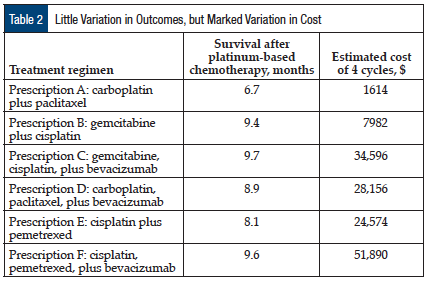 Multiple regimens are approved for most tumor types, and although their toxicities may vary, the differences in outcomes with these regimens are often clinically insignificant. A poignant example comes from a comparison of 6 regimens for the treatment of non–small-cell lung cancer (Table 1). The median overall survival ranged from approximately 10 months with the oldest regimens to 13 months with the newer ones. Although patients “probably would not split hairs over this” survival difference, Dr Malin suggested, toxicity might be more important to many patients. The rates of serious adverse events also had significant differences per regimen, ranging from 18% to more than 44% and deaths while receiving treatment ranged from 0.5% to 7%.