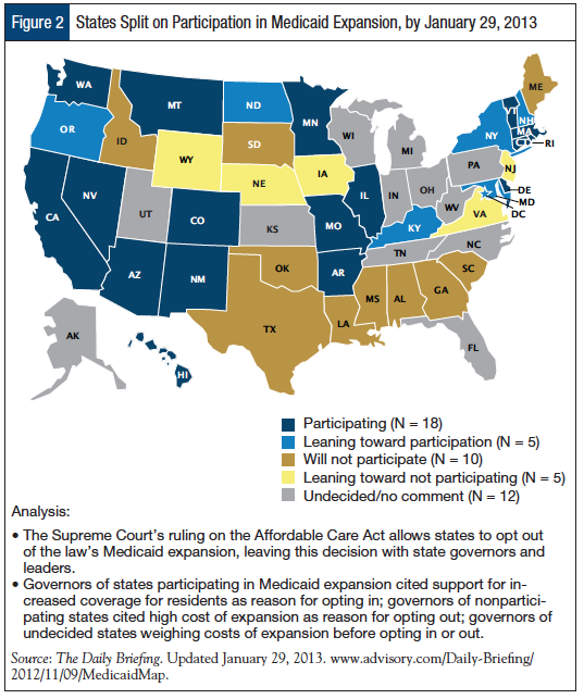 Although currently only approximately 50% of the states are participating in or leaning toward participating in Medicaid expansion (Figure 2), the expectation is that over several years, even many recalcitrant states will come on board, Mr Brow said.