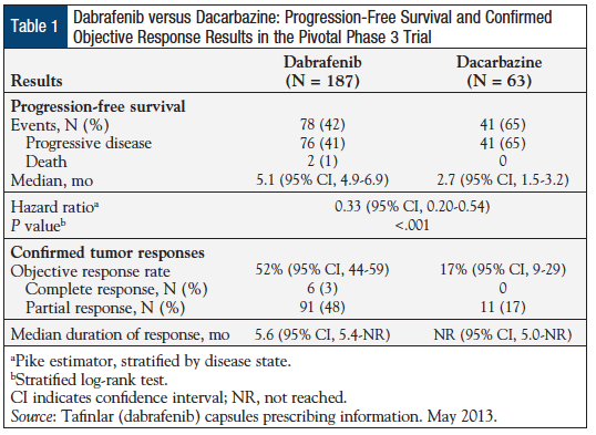 Table 1 summarizes the PFS, the confirmed ORR, and the duration of response in the phase 3 study of dabrafenib in patients with BRAF mutation–positive advanced melanoma.8