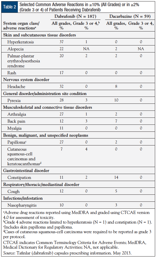 Safety In the phase 3 trial, 53% of patients who received dabrafenib and 44% of patients who received dacarbazine had treatment-related adverse events (grade ≥2).15 The most common adverse events with dabrafenib were skin-related effects, fever, fatigue, arthralgia, and headache.15 Table 2 summarizes the adverse reactions that occurred in ≥10% (all grades) or in ≥2% (grade 3 or 4) of patients who received dabrafenib.8 Grade 3 or 4 adverse events were uncommon in both groups.15