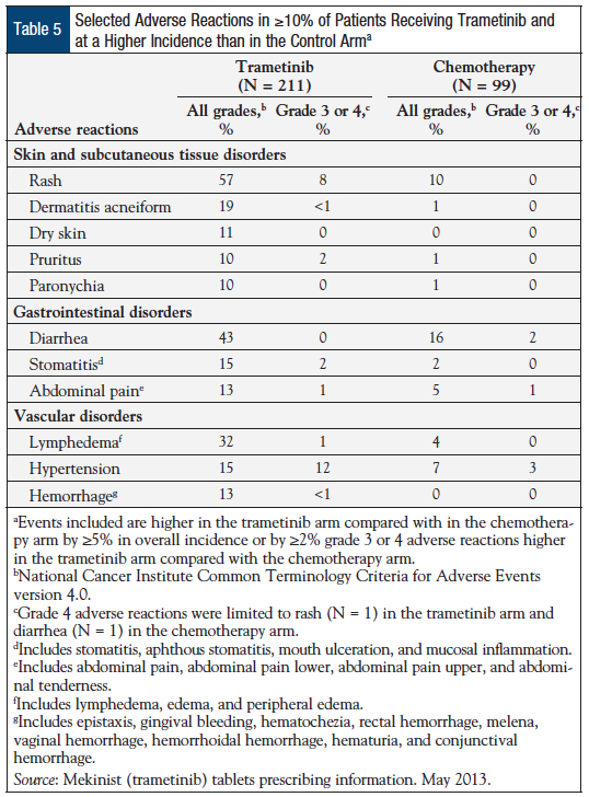 Table 5 summarizes the adverse reactions that occurred in ≥10% of patients who were treated with trametinib and at a higher incidence than in the control arm.9