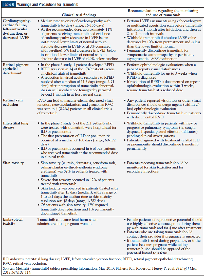 Table 6 summarizes these warnings and precautions associated with the use of trametinib, as well as recommendations for monitoring and appropriate drug use.