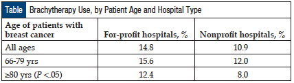 Radiotherapy of any type was more common at for-profit hospitals among women aged ≥80 years. This 22% relative increase in radiotherapy was largely driven by brachytherapy. Brachytherapy was most common in all women who were treated at for-profit hospitals compared with nonprofit hospitals (20.2% vs 15.2%, respectively; P <.001), with the greatest difference observed among the elderly (Table).