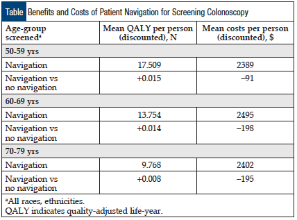 The investigators examined one-time colonoscopy in a cohort reflecting a population at a major New York City hospital. The study compared the costs for patient navigation versus no navigation and no screening, with a time horizon through age 100 years or death. Outputs were mean discounted quality-adjusted life-years (QALYs) and costs per person. The base-case inputs were based on navigation studies and 2012 Medicare payments.