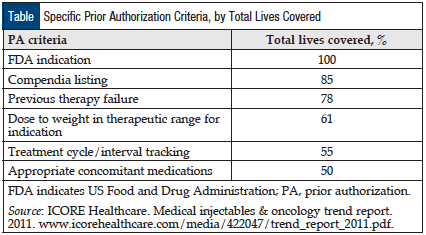 Many criteria can be applied to prior authorizations. A 2011 trend survey from ICORE Healthcare described the respondents’ prior authorization criteria for injectables (Table).