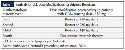Table 1 summarizes ibrutinib dose modification guidelines for patients with any grade ?3 nonhematologic toxicity, grade ?3 neutropenia with infection or fever, or grade 4 hematologic toxicities. Ibrutinib may be reinitiated at the starting dose after symptoms of toxicity have resolved to grade 1 or to baseline.15