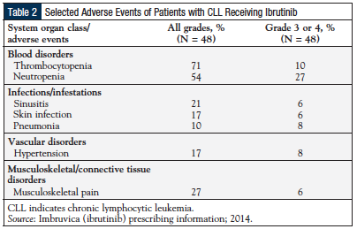 Adverse Events The 48 previously treated CLL patients who received ibrutinib in the phase 2 clinical trial received 420 mg daily for a median of 15.6 months.15 Adverse reactions that occurred at a frequency of ?20% included thrombocytopenia (71%, all grades), diarrhea (63%), bruising (54%), neutropenia (54%), upper respiratory tract infection (48%), anemia (44%), fatigue (31%), musculoskeletal pain (27%), rash (27%), pyrexia (25%), constipation (23%), peripheral edema (23%), arthralgia (23%), nausea (21%), stomatitis (21%), sinusitis (21%), and dizziness (21%).15
