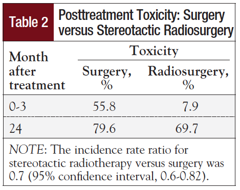 Patients in the surgery group had significantly higher rates of toxicity (P <.001) compared with patients in the SBRT group at 0 to 3 months (Table 2).