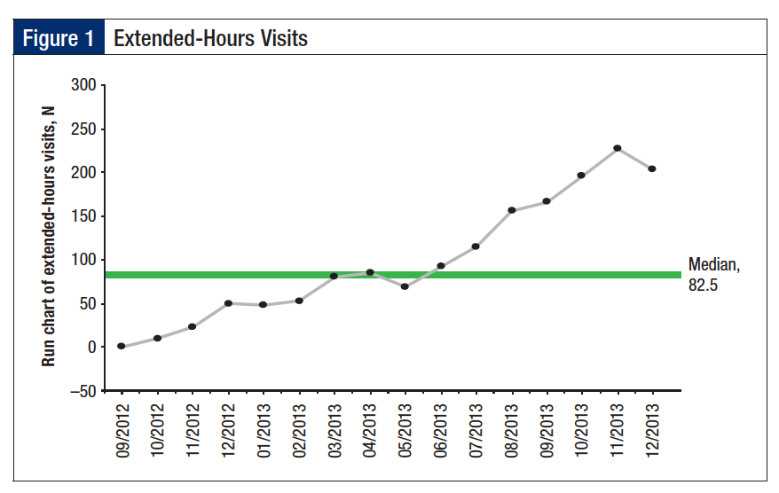All participating practices in the COME HOME initiative now offer evening and weekend hours. The number of extended-hours visits has been climbing among the practices, to a median of 82.5 (Figure 1).