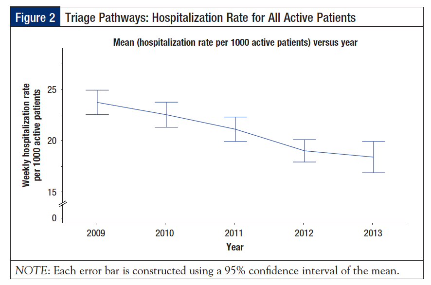 The triage pathways have paid off in the form of fewer hospitalizations for all active patients (Figure 2). The overall patient satisfaction rate was a median of 91%.