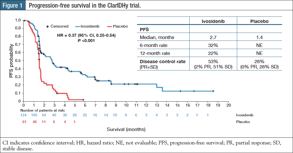 Median PFS was 2.7 months in the ivosidenib group versus 1.4 months in the placebo arm (HR, 0.37; 95% CI, 0.25-0.54; P <.001).18 In the ivosidenib treatment arm, PFS was 32% at 6 months and 22% at 12 months, which is impressive when considering that the OS in this late-line setting is typically measured on the order of a few months (Figure 1).18 These values were not evaluable in the placebo arm because of crossover. Treatment with ivosidenib was associated with a greater disease control rate of 53%, including 2 confirmed partial responses, compared with placebo recipients, in whom stable disease was documented in only 28%.19