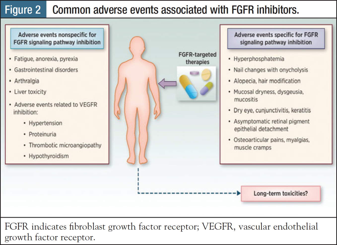 Unique toxicities associated with FGFR inhibitors as a class include hyperphosphatemia, fatigue, stomatitis, alopecia, decreased appetite, dry skin, dry mouth, and nail toxicity (Figure 2).33 Although most of the toxicities are grade 1 or 2, overall, 63.2% of the patients receiving infigratinib therapy require dose reduction and 77% require dose interruption. Nail toxicities also result in dose delay.34