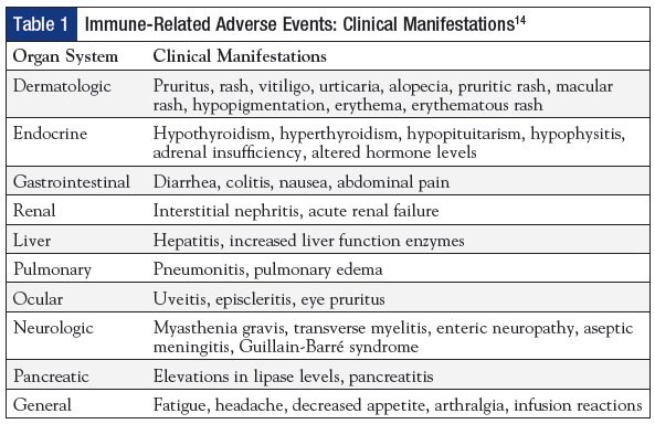 Importantly, the adverse event profile and patterns observed with checkpoint inhibitors are distinct from those observed with conventional chemotherapy or biologic agents, underscoring the need for healthcare professionals and patients alike to become aware of these differences and their management. Several organ-specific immune-related adverse events (irAE) have been documented that are autoimmunelike/inflammatory in nature, including endocrinopathies, diarrhea/colitis, dermatitis, hepatitis, pneumonitis, and nephritis (Table 1).14,15 In particular, pneumonitis is of concern in patients with lung cancer. The severity and onset of irAEs are variable and may depend on the organ system affected and dose of drug; although the majority of irAEs are low grade, a few may be severe and life-threatening.14 Onset of irAEs typically occurs within the first treatment cycle, but many might occur after several months of treatment and even after treatment discontinuation.14 Therefore, successful management of irAEs warrants constant monitoring for potential select AEs; utilization of treatment algorithms; ongoing education of patients, family, and healthcare professionals; and referral to specialists, when needed.14 Standard treatment algorithms for irAEs include use of immunomodulating medications, including corticosteroids, antihistamines, and anti–tumor necrosis factor medications.15 For patients receiving steroid treatment for irAEs, steroids must be tapered off over at least 30 days15 to avoid a flare in toxicity; proton pump inhibitors, antimicrobial prophylaxis, and vitamin D and calcium supplementation are essential.