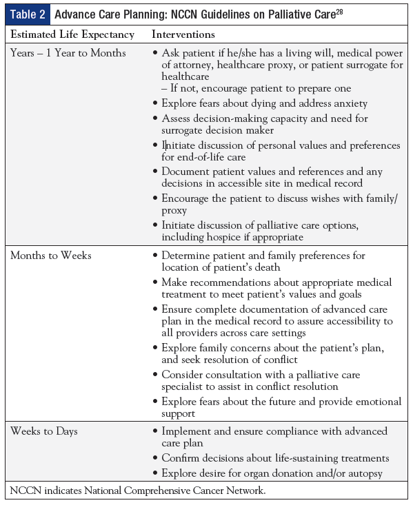 Although palliative care is appropriate at any disease stage, a misconception persists that it refers to end-of-life care and that it is not needed while undergoing active treatment with curative intent. Delivering palliative care early in the disease management process can improve quality of life and can assist with the transition into hospice care at end of life. The National Consensus Project for Quality Palliative Care and the NCCN Clinical Practice Guidelines in Oncology: Palliative Care are 2 important resources; the NCCN guidelines outline advance care planning, including recommended interventions and ongoing reassessment (Table 2).28,29