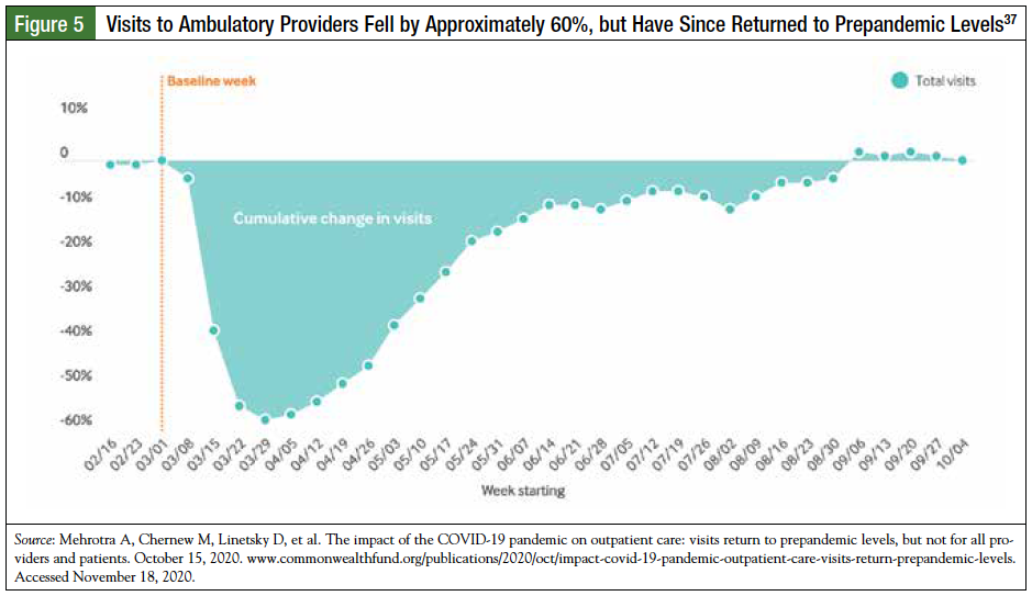By early April 2020, visits to ambulatory providers fell by approximately 60%, but have since returned to prepandemic levels (Figure 5).37 However, there are differences based on factors such as age, with younger-child visits remaining substantially below levels seen before the COVID-19 pandemic. Additionally, the percentage of all visits via telemedicine has been declining slowly since it peaked at approximately 14% in April 2020 but remains well above levels seen before the COVID-19 pandemic.