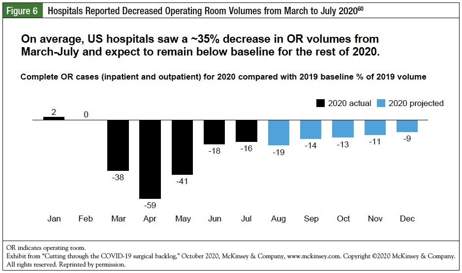 Individual centers have reported delaying nonurgent or elective surgeries during periods with peak COVID-19 cases.58,59 From March to July 2020, US hospitals reported an average 35% decrease in operating room volumes, and are expected to remain below 2019 levels for the remainder of the year (Figure 6).60 It is not clear how these delays may impact cancer progression and patient outcomes; however, results from a modeling study of 94,912 patients undergoing resections for major cancers annually suggest that a 3-month delay of surgery across cancers of stages I to III would contribute to 4755 deaths attributable to the delay, and a 6-month delay would contribute to 10,760 deaths attributable to the delay.61 The current focus of surgical oncologists and multidisciplinary teams is to prioritize surgeries using clinical rationale and potential strategies for nonsurgical management, with the decisions based on available resources.62