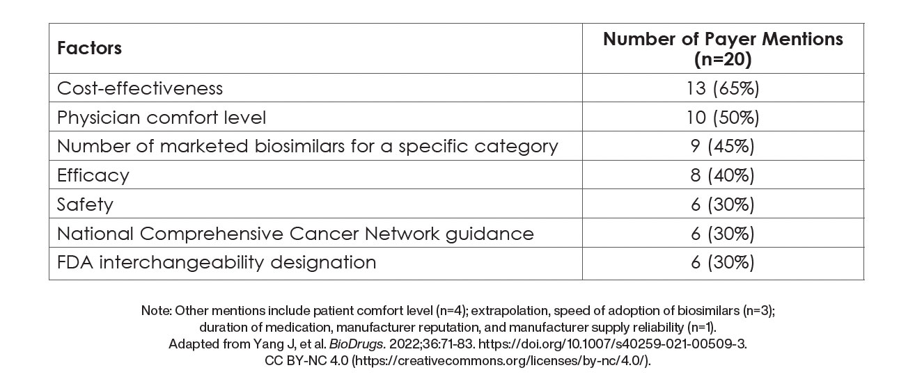 US payers can also be vital in stimulating broad biosimilar adoption via formularies and utilization management strategies. In a series of qualitative interviews, US payers indicated that cost-effectiveness was the most critical factor influencing positive perceptions of biosimilar adoption (Table).24